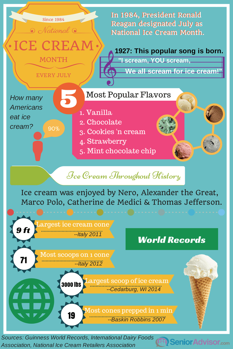 Considering that 90% of the American population enjoys ice cream, and that we each consume 20 quarts of ice cream on average each year, it’s no surprise that the US eats more ice cream than any other country. So it only made sense in 1984 when President Ronald Reagan designated July National Ice Cream Month, and the third Sunday of the month as National Ice Cream Day. In honor of the holiday, we’ve put together an infographic sharing some of the history and fun facts of this delectable food.